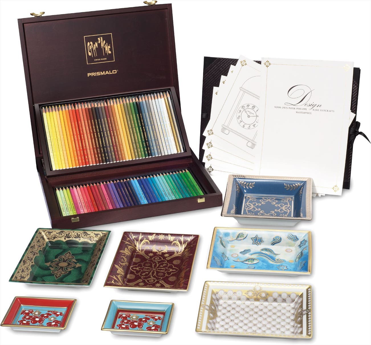 A group of seven limoges porcelain and enamel dishes and a set of water-soluble colour pencils in assortment of 80 colours by Caran d'Ache for Patek Philippe