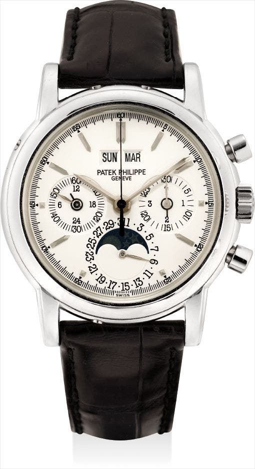 A fine and rare platinum perpetual calendar chronograph wristwatch with moon phases with additional case back, duplicate original certificate and fitted presentation box