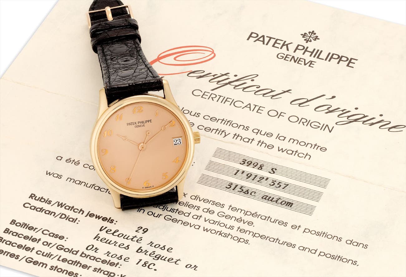 With <em>Patek Philippe </em>Certificate of Origin dated October 1993, product literature, instruction manual and leather wallet. Furthermore delivered with <em>Patek Philippe</em> Extract from the Archives confirming production of the present watch with velvet rose dial and 11 Breguet numerals in pink gold in 1993 and its subsequent sale on 27 October 1993.