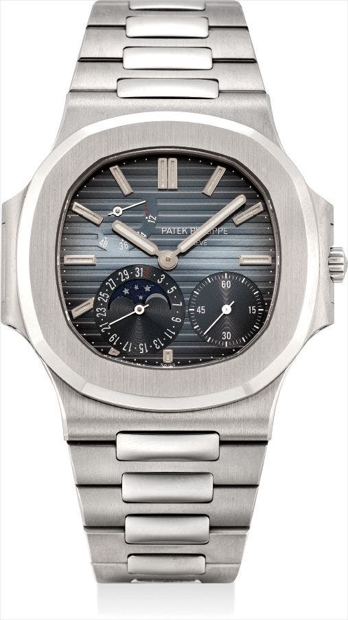 A fine and rare stainless steel wristwatch with date, moon phases, power reserve and bracelet, original certificate and fitted presentation box