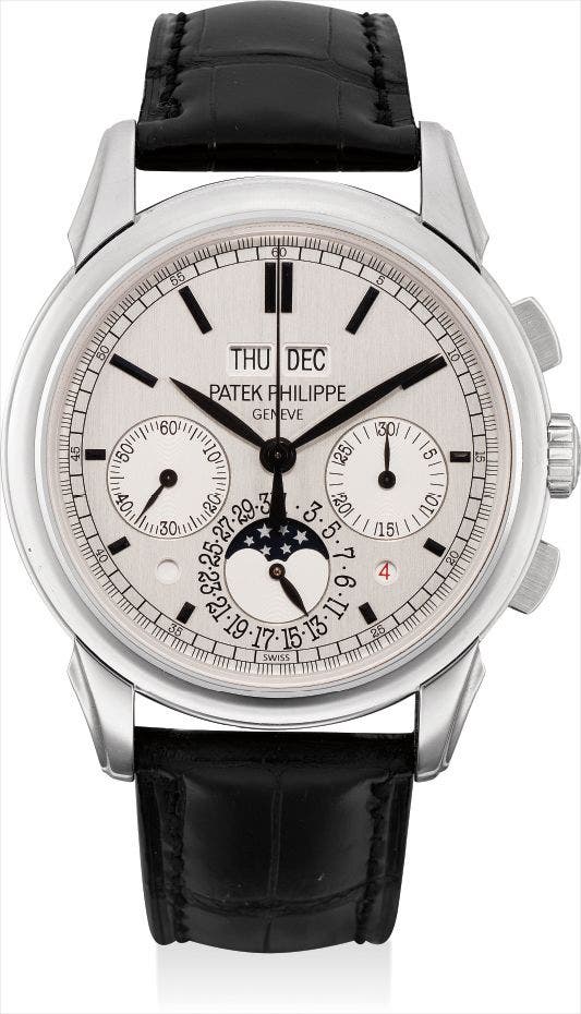 A fine and rare white gold perpetual calendar chronograph wristwatch with moon phases, leap year and day and night indicator, additional case back, original certificate and fitted presentation box