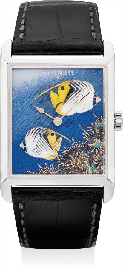 A fine and rare platinum rectangular wristwatch with cloisonné enamel dial and original certificate