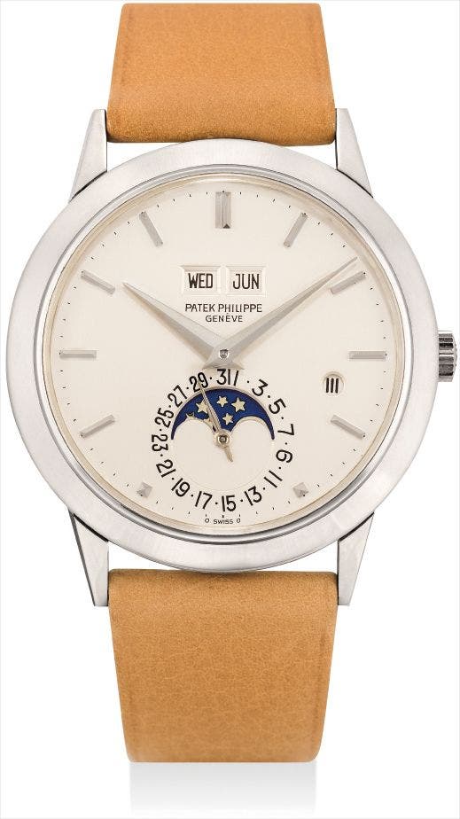 An extremely rare and highly important white gold perpetual calendar wristwatch with moon phases, leap year indicator, original certificate and fitted presentation box
