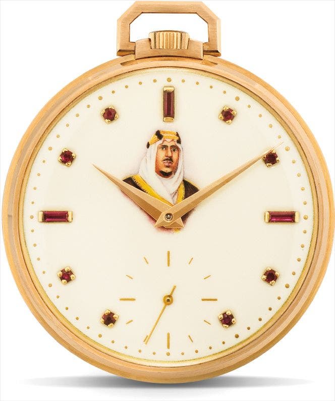 A fine, rare and unusual pink gold and ruby-set open facewatch with tinted enamel dial and polychrome enamel portrait of King Abdul al-Aziz III Ibn Saud