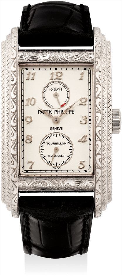 An extremely rare and highly unusual white gold rectangular 10 day tourbillon chronometer wristwatch with 10 day power reserve, hand crafted engraved case, original certificate and fitted presentation box