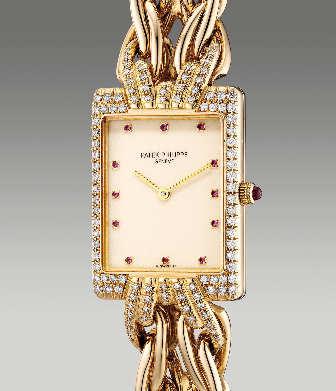 A lady’s fine and elegant rectangular-shaped yellow gold and diamond-set wristwatch with ivory dial, ruby-set indexes, integrated bracelet, Certificate of Origin and fitted presentation box