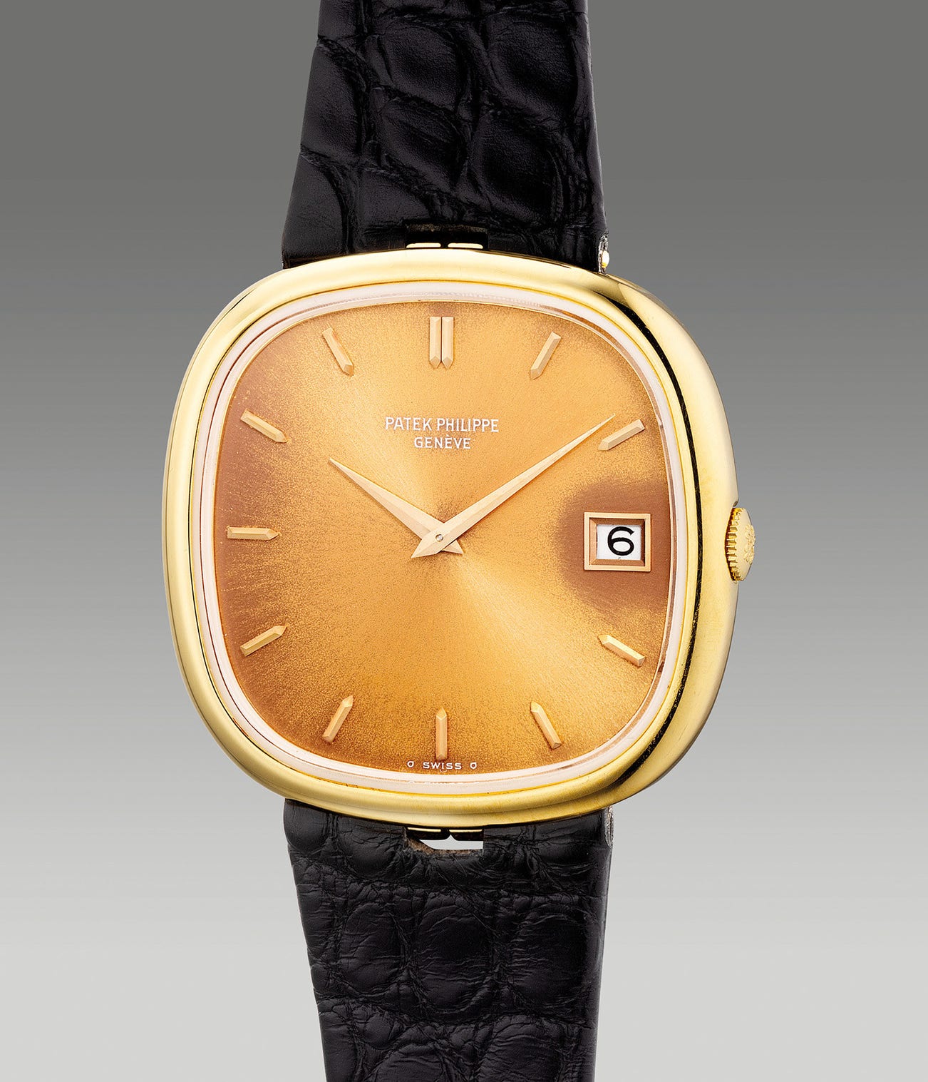 A fine yellow gold cushion-shaped wristwatch with date and “tropical” brown sunburst dial