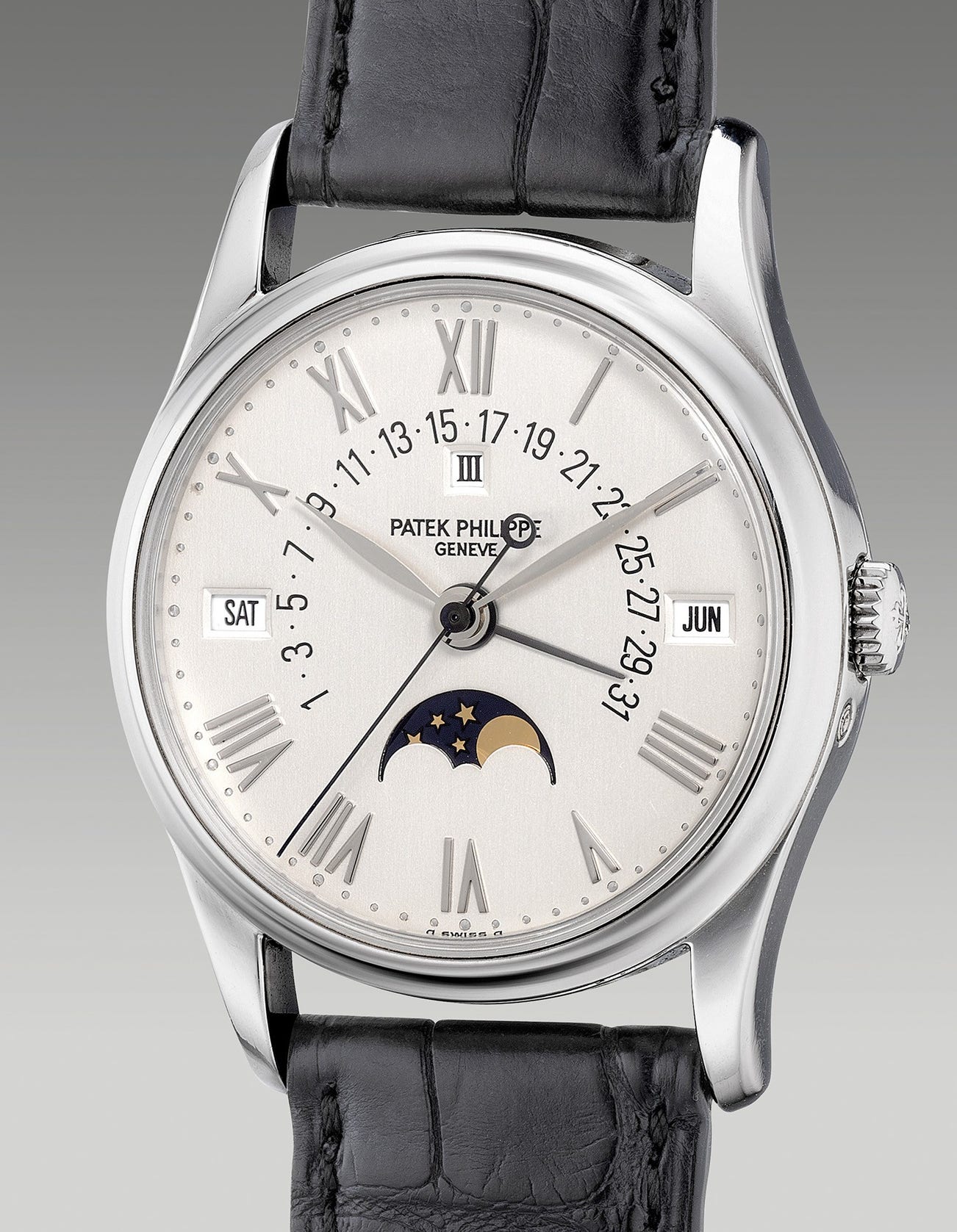 Introduced at Baselworld in 1993, the reference 5050 was Patek Philippe’s first perpetual calendar wristwatch with retrograde date produced in series. The 35mm diameter two-piece case by Favre-Perret was launched in yellow gold, pink gold, white gold, and platinum. Research estimates that approximately 150 examples were encased in platinum in three series throughout its nine-year production span. The first featured thin painted Roman numerals, while the second series, released in 1995 featured the much-requested applied baton indexes and an “Automatic” designation below the moon phase. The third series, like the present platinum example, had applied Roman numerals without the “Automatic” signature.