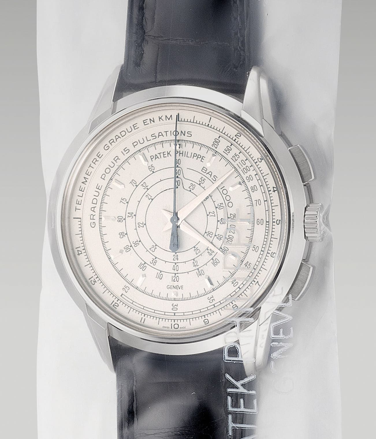 A fine and rare limited edition white gold “Multi-Scale” chronograph wristwatch with Certificate of Origin and presentation box, made to commemorate the 175th anniversary of Patek Philippe, factory sealed