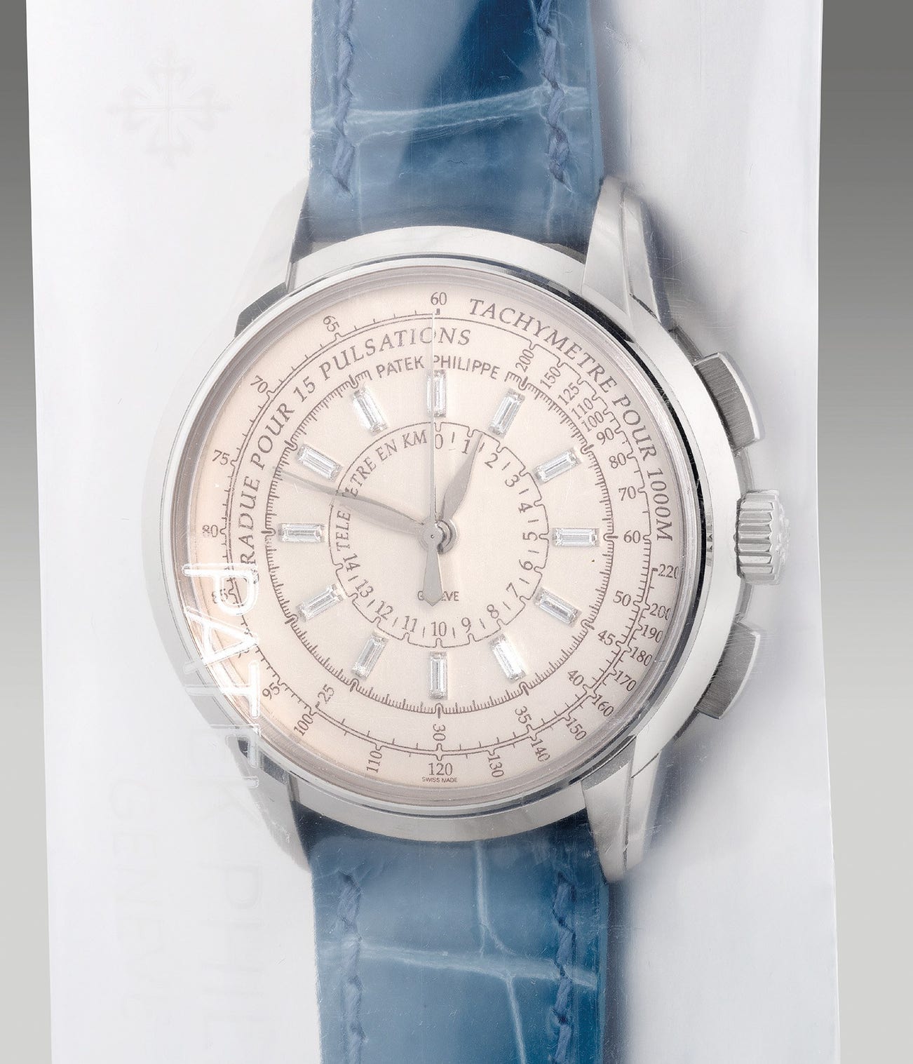 A lady's very fine and rare white gold and diamond-set "Multi-Scale" chronograph wristwatch with Certificate of Origin and presentation box, made to commemorate the 175th anniversary of Patek Philippe, factory sealed