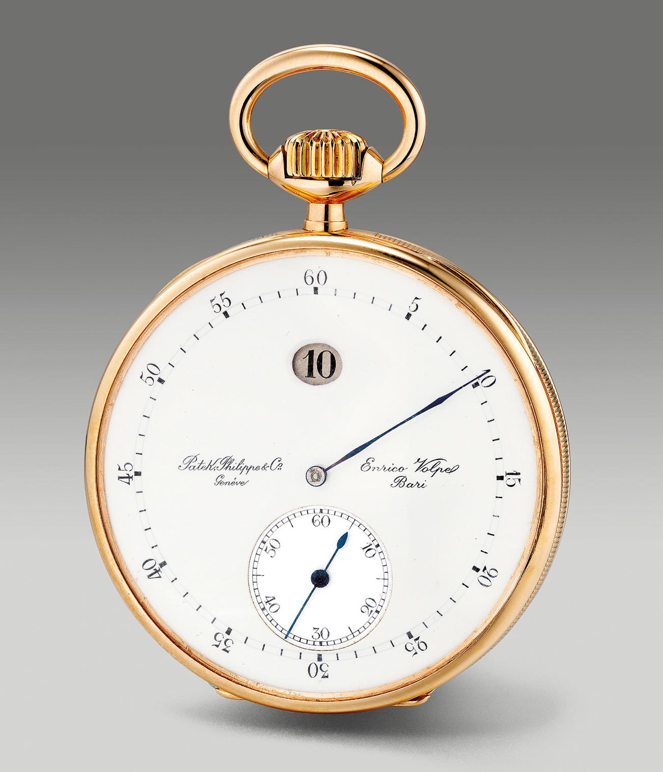 A fine and rare pink gold open faced pocket watch with small seconds, keyless lever, jump hour and enamel dial, retailed by Enrico Volpe, Bari