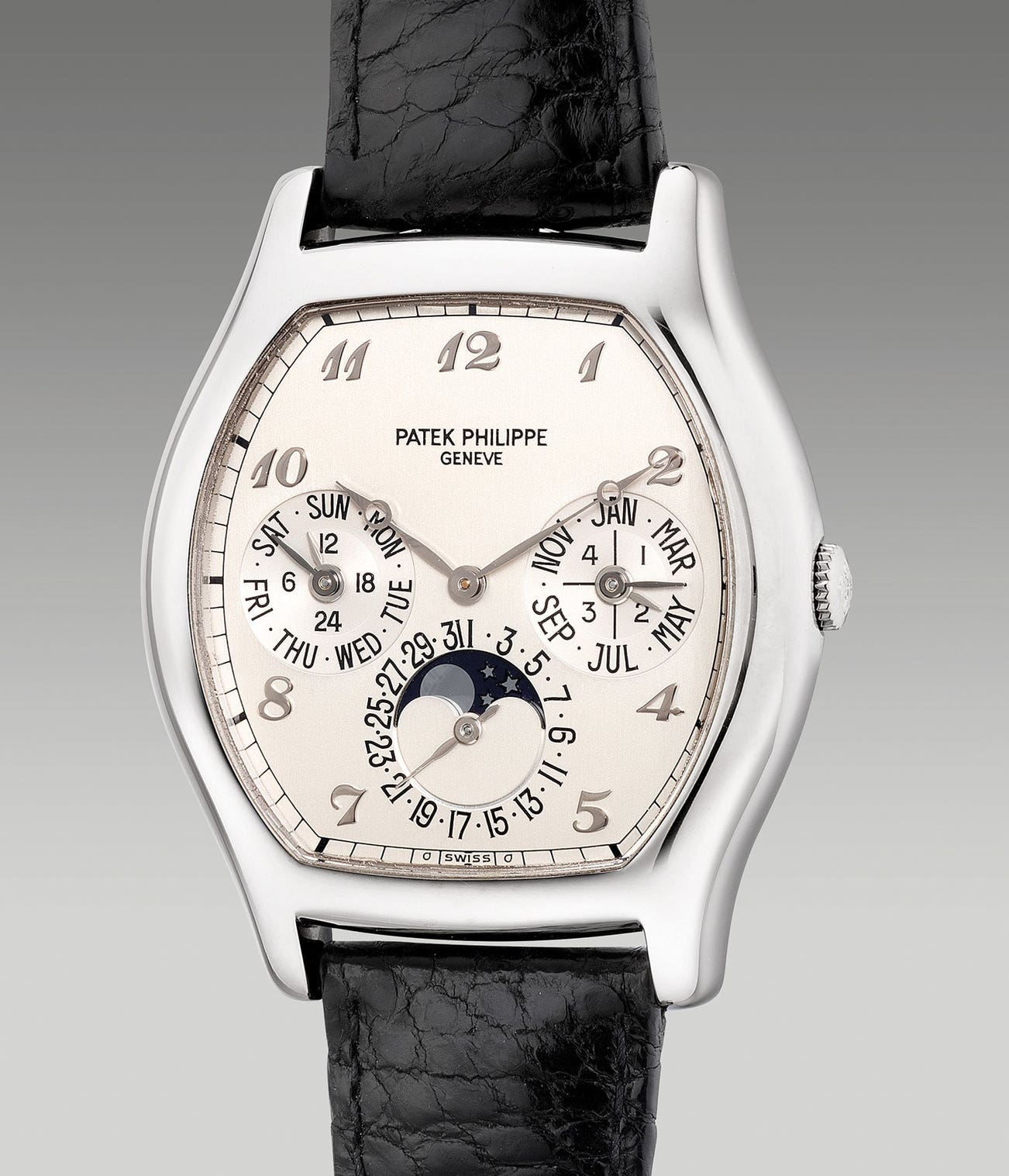 A fine and attractive white gold tonneau-shaped perpetual calendar wristwatch with moon phases, leap year indication, Breguet numerals, Certificate of Origin and presentation box