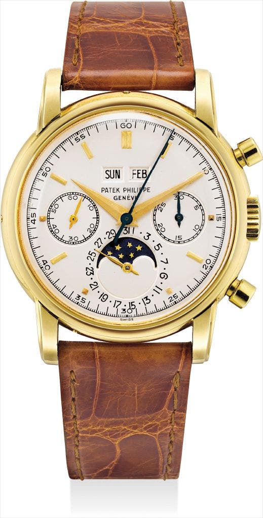 An important, extremely fine and very rare gold perpetual calendar chronograph wristwatch with moon phases