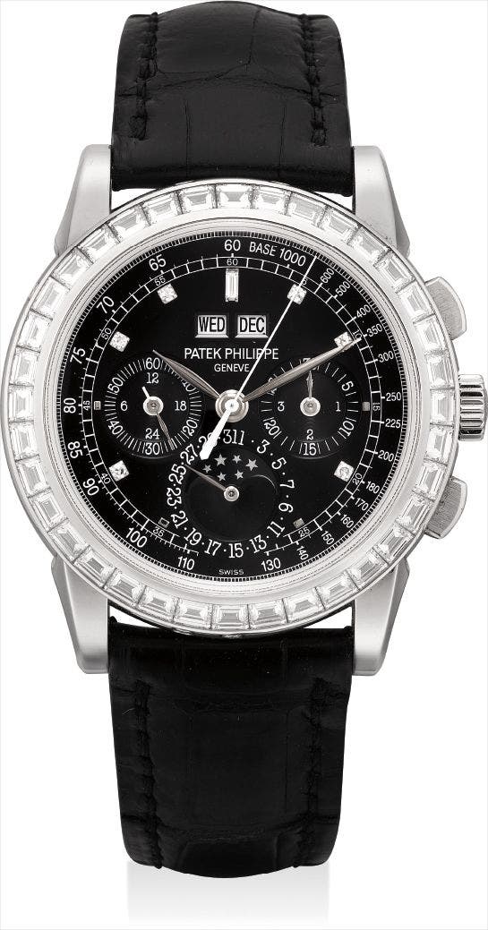 A extremely fine and very rare platinum diamond-set perpetual calendar chronograph wristwatch with moon phases, leap year indicator, additional case back, original certificate and fitted presentation box