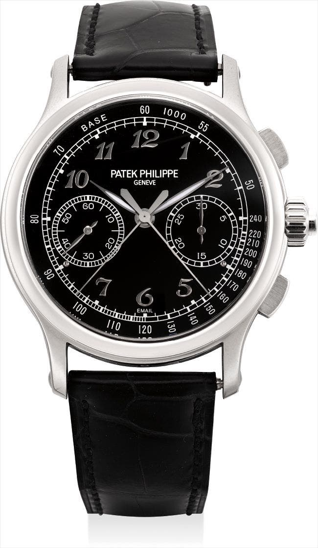 A superlative and very rare platinum split seconds chronograph wristwatch with enamel dial, original certificate and presentation box