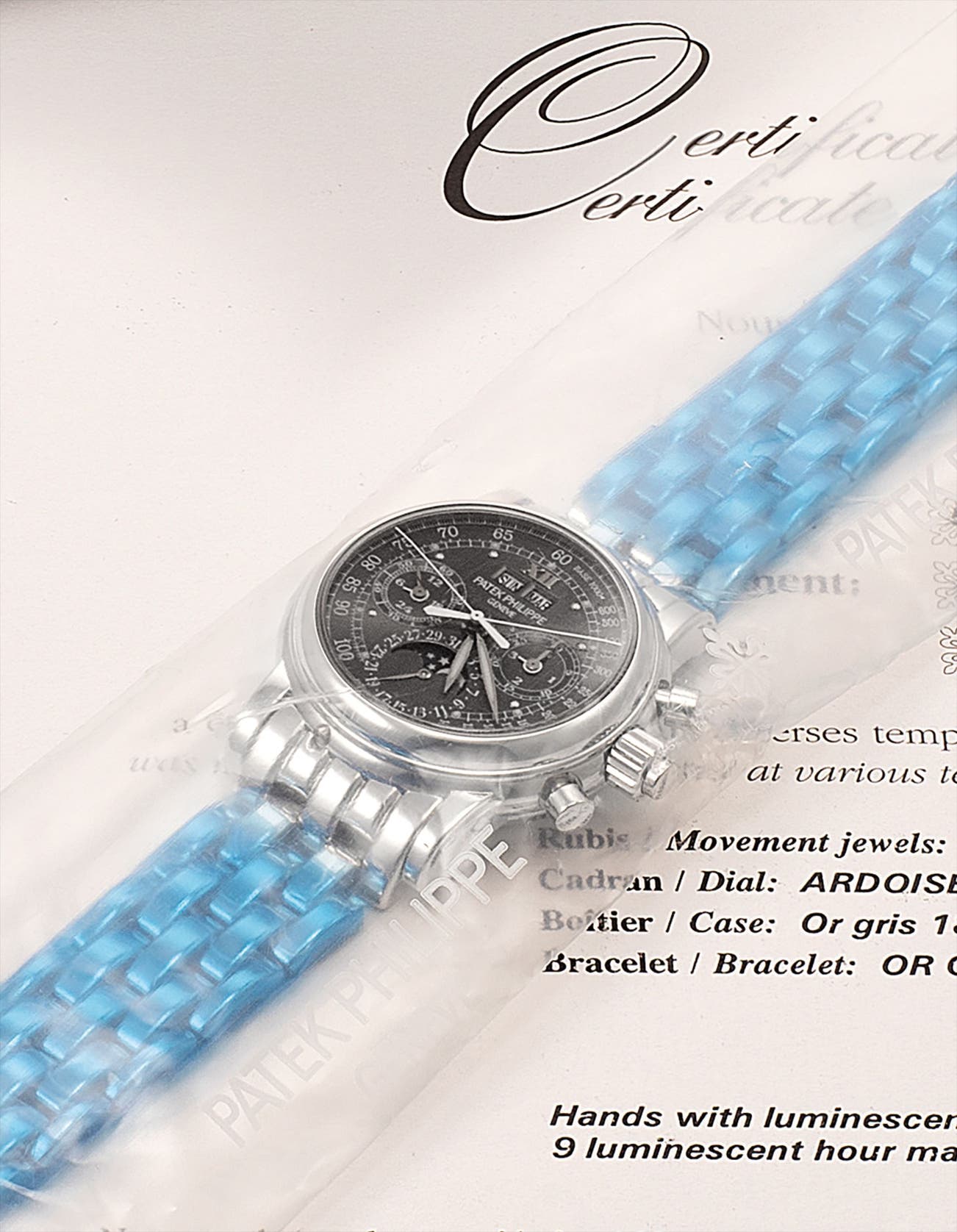 This example of 5004 can be considered without a doubt one of the – if not the – most important specimen of this already legendary reference. Even a cursory glance cannot miss the most unusual timepiece peeking at the beholder from behind the factory sealed sleeve. At first, one is mystified by the slate grey color of the dial. Then, the eye drifts to the massive white gold bracelet, obviously not a factory option for