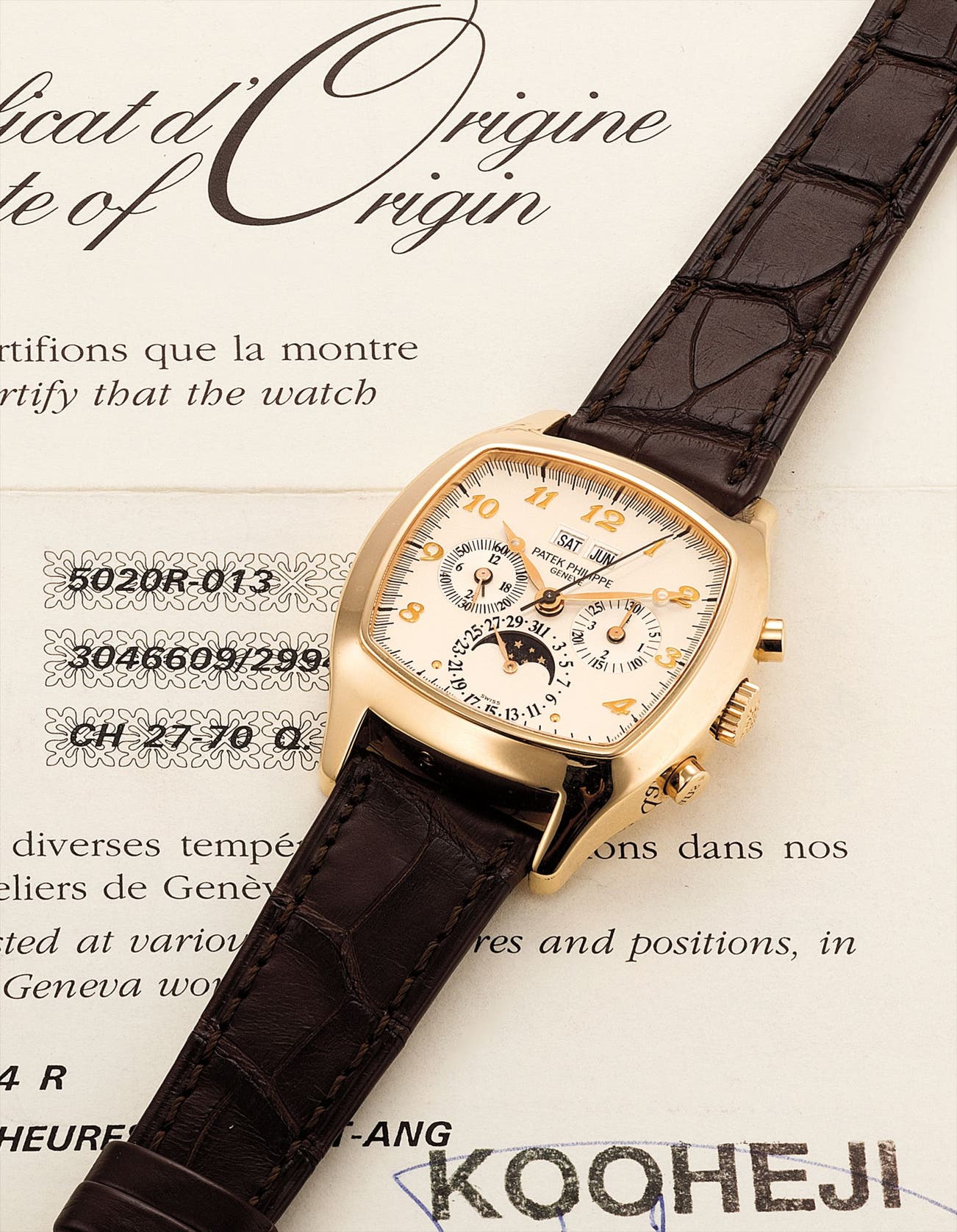 An extremely fine and very rare pink gold perpetual calendar chronograph wristwatch with moon phase, certificate and box