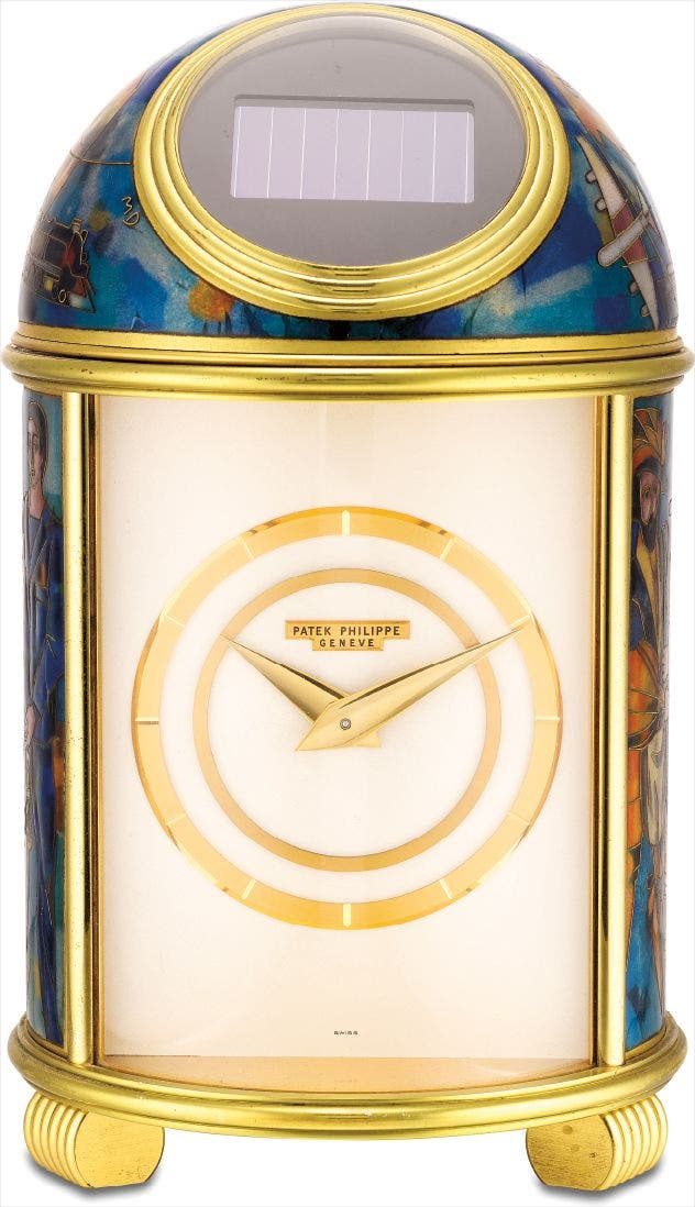 An extremely fine and unique gilt brass solar power dome table clock with cloisonné enamel scene, 'Teinturerie' signed MD, with fitted presentation box