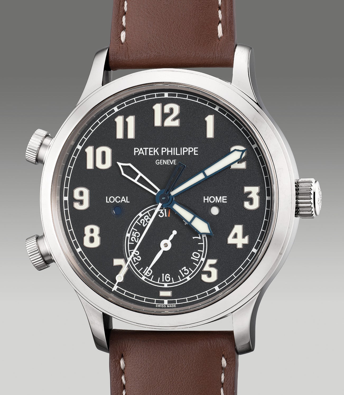 Encased in a 42mm diameter white gold Calatrava-style case, the watch features an Art Deco inspired dial with oversized luminous filled applied white gold Arabic numerals against a grainy matte dark navy blue dial, blued sword hands and an additional skeletonized hand for the second time zone with apertures for day and night indication for each time zone, while a register at 6 o’clock indicates the date. The case features two patent pending adjusters for setting the additional time zone. In 2018, Patek Philippe released their first ladies Calatrava Pilot’s Travel Time ref. 7234R after a successful reception of the ref. 5524G.