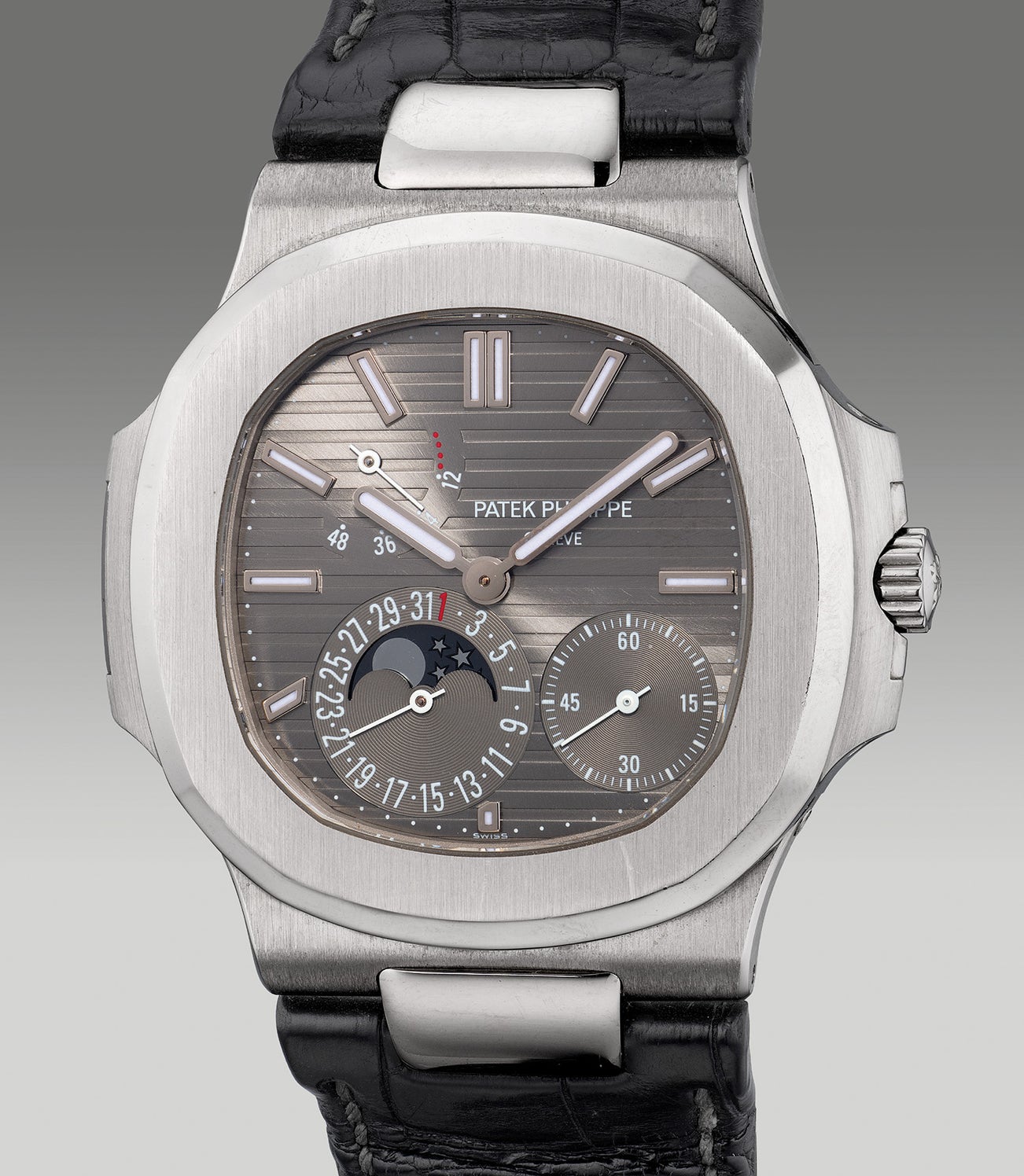 The ref. 5712G-001 was one of the most complicated Nautilus models offered at the time designed to be a feature-packed wristwatch with sophistication. Encased in white gold, the timepiece displays a smoky grey dial instead of the blue dial featured in the stainless steel model. Adding depth and legibility is a small detail highlighted in red such as the four dotted power reserve and the first day of the calendar. Offered in a crocodile strap pairing, the ref. 5712G-001 gives collectors a luxurious alternative to the sport model, giving it an elegant twist for the discerning ladies and gentlemen.