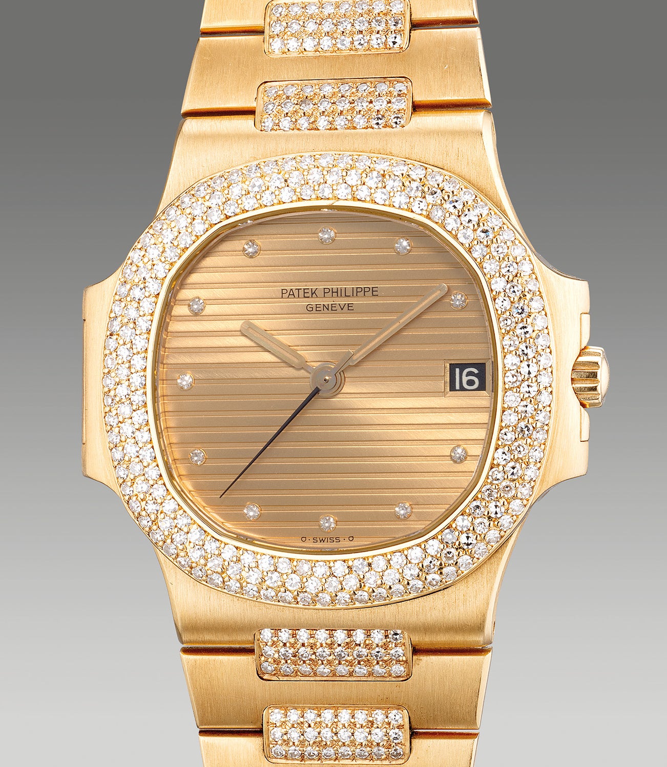 Moving further away from the idea of a sports watch, the present yellow gold Nautilus is embellished with a luxurious touch. Encircled by three brilliant rows of diamonds all around the bezel, the present ref. 3800/5 is fitted with a stunningly appropriate matching gold dial with 11 brilliant-cut diamonds gracefully decorating every hour marker. According to research, the use of black date discs was exclusively used in the early stages of production and phased out from around 1990s onwards.