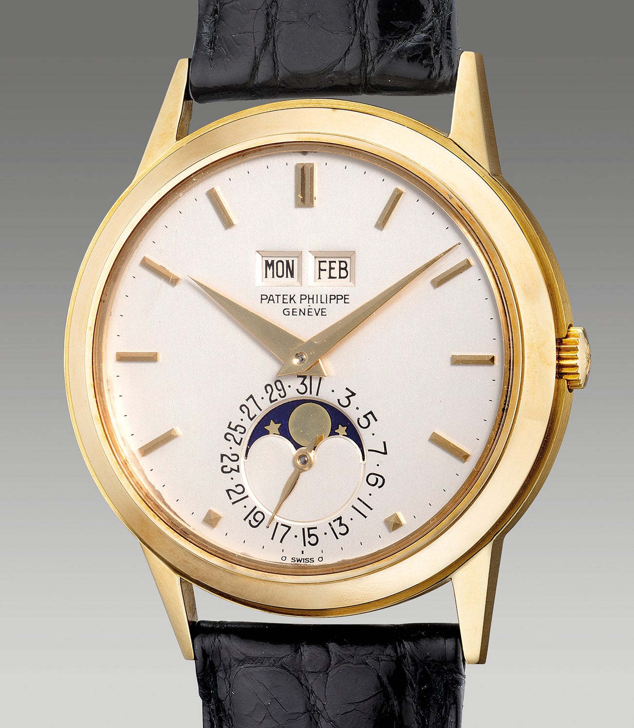 An extremely fine, rare and well-preserved yellow gold perpetual calendar wristwatch with moon phases