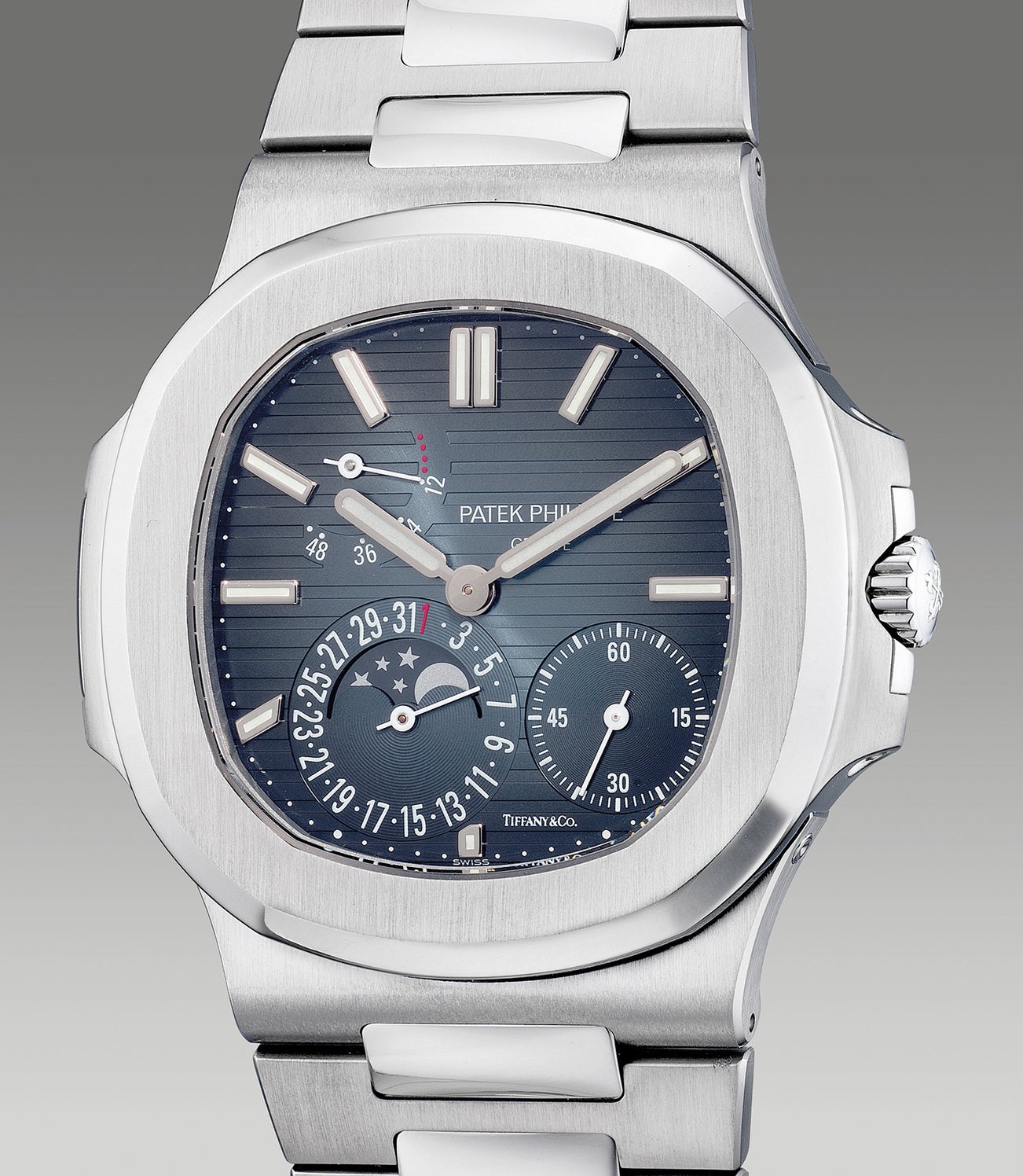 An extremely rare and fine stainless steel wristwatch with small seconds, power reserve indication, date, moon phases, bracelet, Certificate of Origin and presentation box, retailed by Tiffany & Co.
