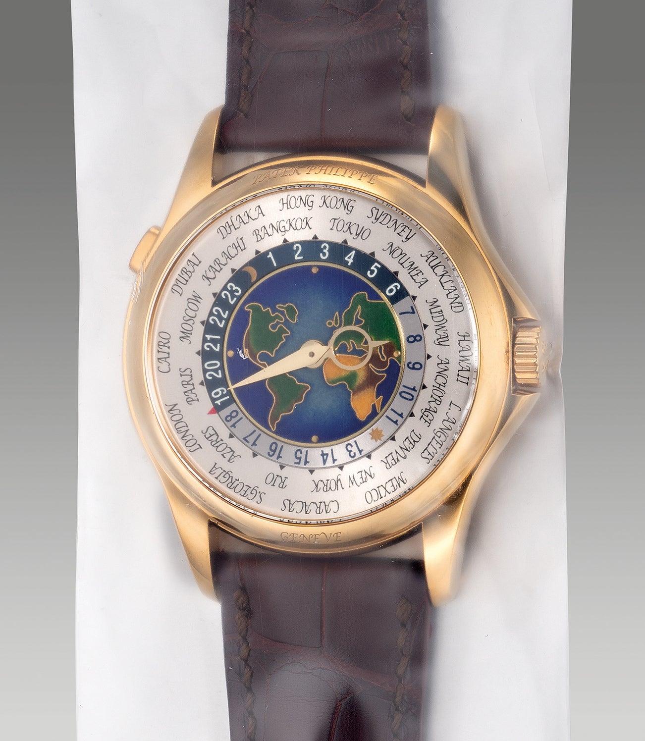 A very fine yellow gold world time wristwatch with cloisonné enamel dial with Certificate of Origin and presentation box, single sealed