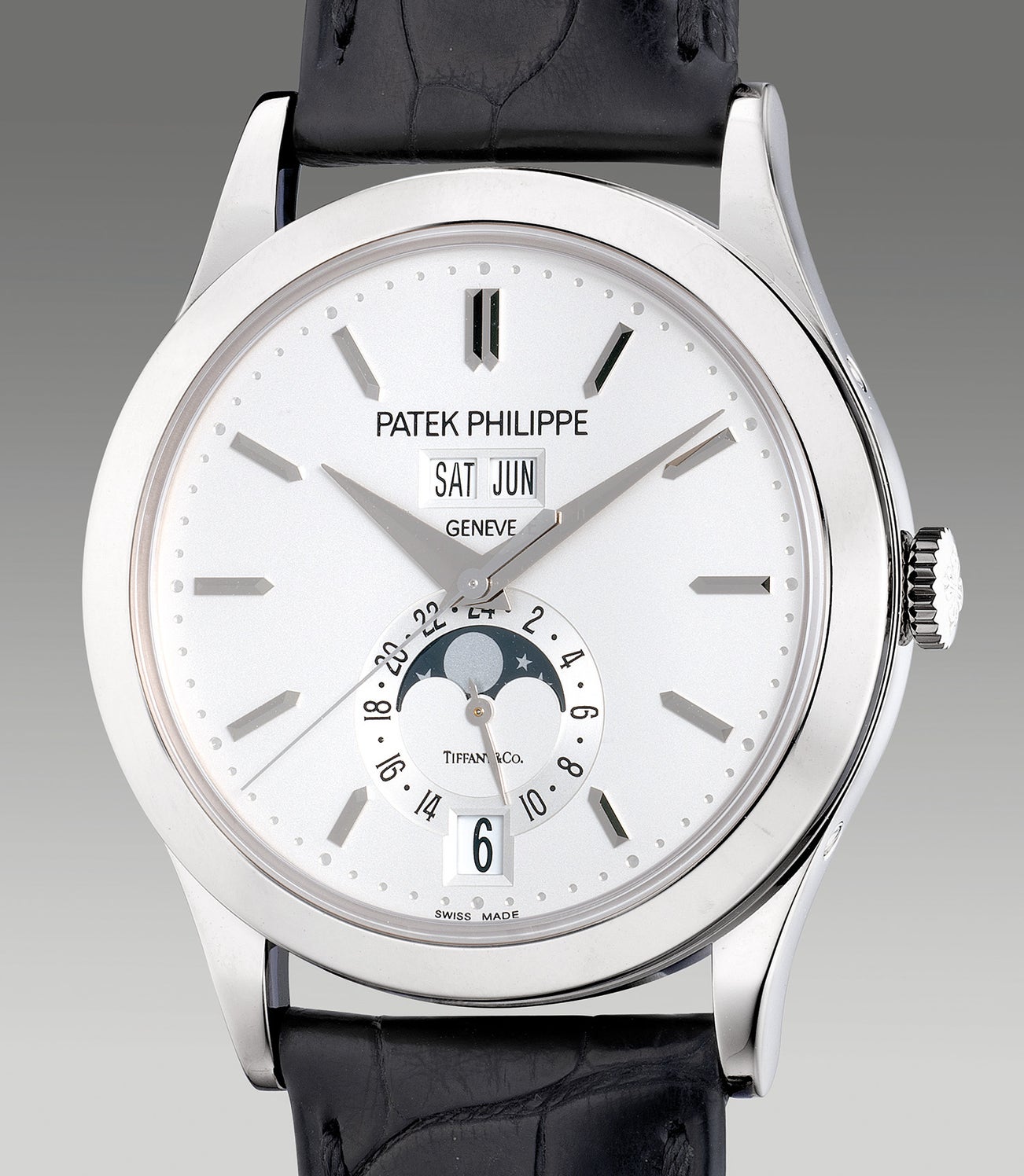 An attractive and rare white gold annual calendar wristwatch with center seconds,24-hour indication, moon phases, Certificate of Origin and presentation box, retailed by Tiffany & Co.