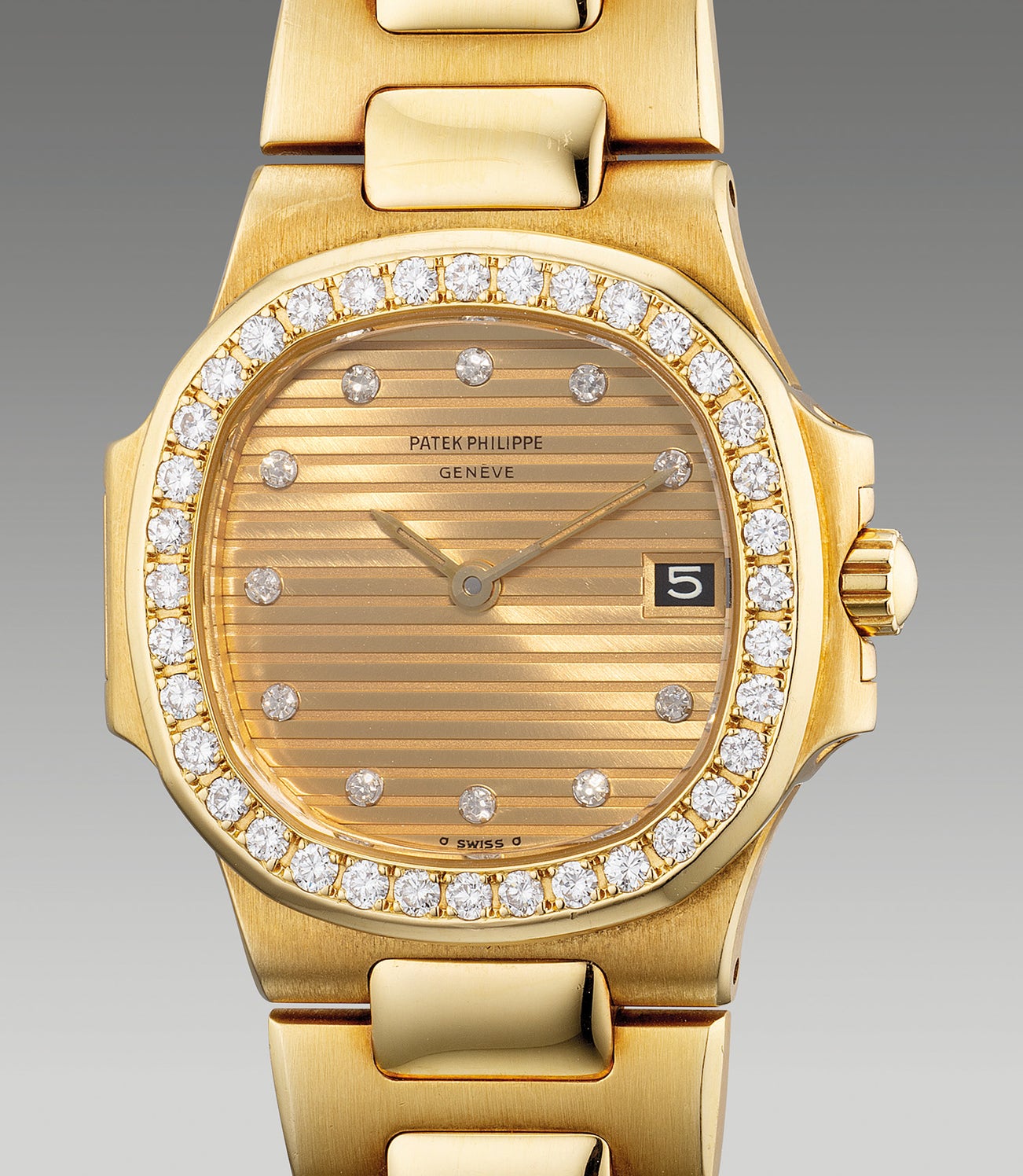 The present example Patek Philippe ref. 4700/3 in yellow gold is lavishly decorated with a diamond-set bezel and indexes fitted with a gilt ribbed dial matching harmoniously with the hue of the yellow gold case. Offered in attractive overall condition with a Patek Philippe Extract from the Archive confirming its production of the present timepiece in 1983 and its original presentation box, this will surely please the trendy lady collector seeking for an exquisite timepiece.