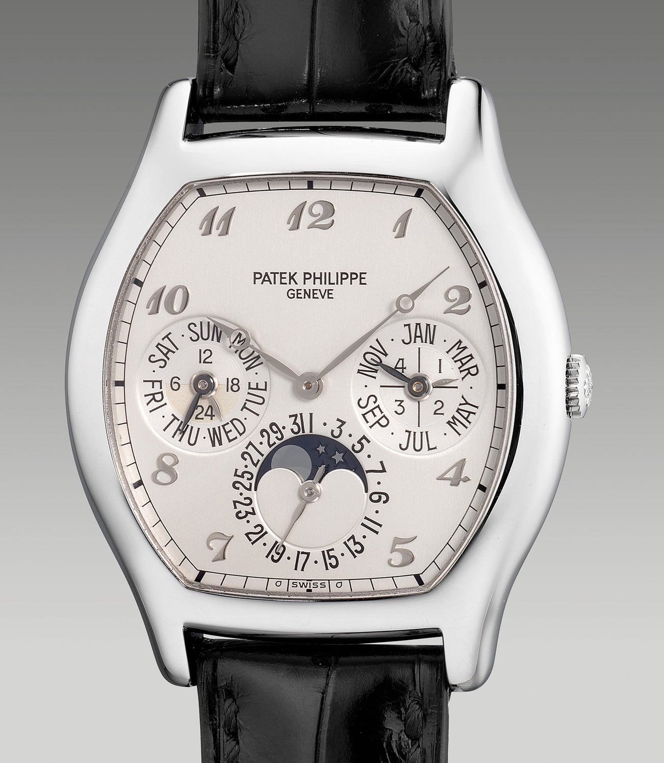 A fine and rare platinum tonneau-shaped perpetual calendar wristwatch with Breguet numerals, moon phases, 24-hour indication, leap year indication, Certificate of Origin and presentation box