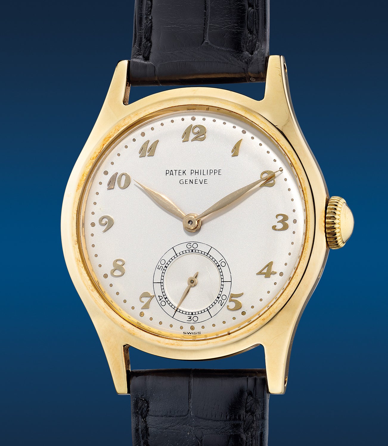 The present example ref. 565 in yellow gold from 1950 fitted with cal. 12”’120 is one of the last examples before the transition to cal. 12”’400. Extremely attractive and highly desirable, it is fitted with one of the most valuable dial variants featuring applied gold Breguet numerals. Not only is it rare, the state of preservation of the present timepiece is one of the most impressive seen in recent times. Fresh-to-the-market, the present ref. 565 is the 14th example to appear in the market with the caliber 12”’120 . Boasting a clean dial with desirable raised enamel signature, the case features strong bevels as well as two crisp and deep hallmarks. Further delivered with a Patek Philippe Extract from the Archives confirming its production in 1950, this is a fantastic opportunity for collectors of fine vintage timepieces to acquire a rare, desirable and well-preserved example of the coveted ref. 565 in yellow gold.