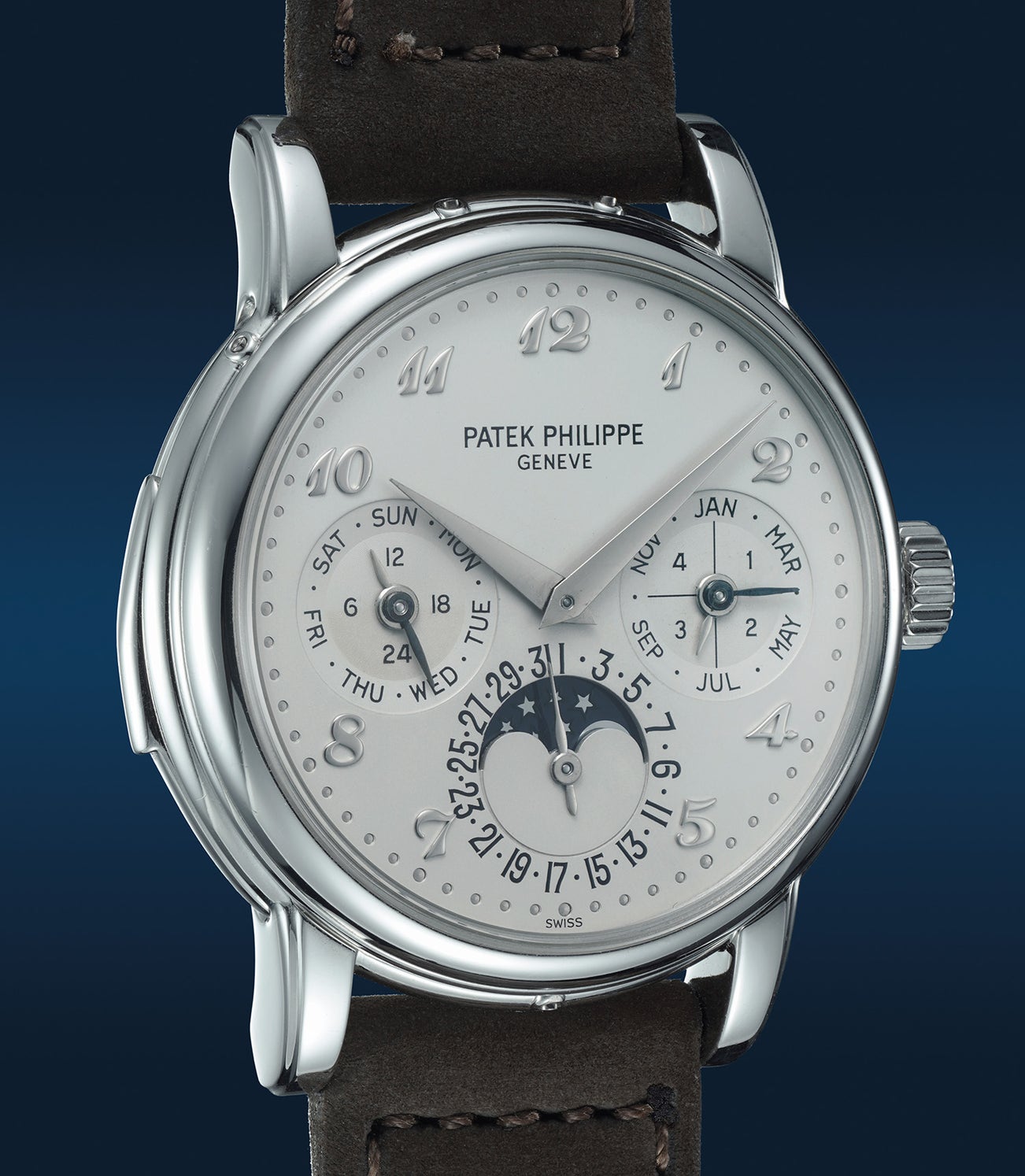 According to our research, only 8 examples of the ref. 3974 in platinum have ever been offered at auction. Only a mere of 2 examples of a Patek Philippe ref. 3974P has the luxury of being fitted with a Breguet numerals dial.