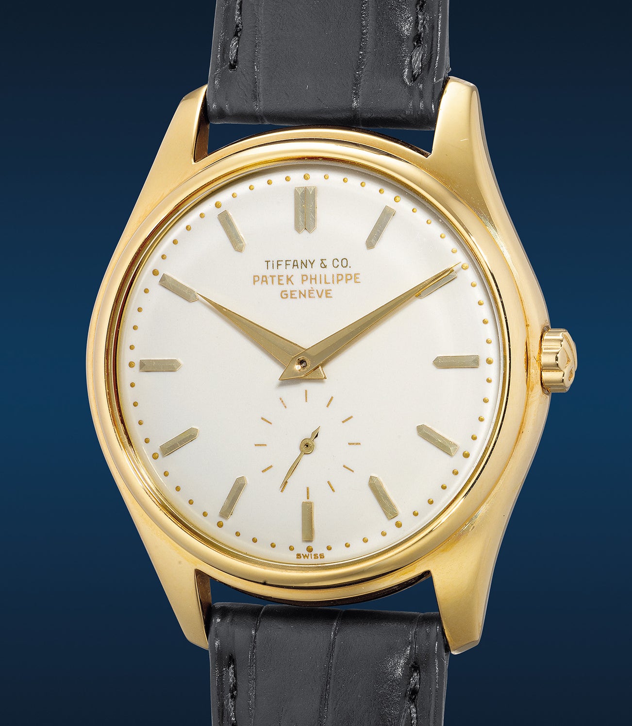 The present example Patek Philippe ref. 2526 in yellow gold from the first series features case and movement numbers that are consistent with examples from the respective series. Featuring an off-white enamel dial with shorter index at 6 o’clock and a domed screw-down caseback topping it off with its original forged “double P” crown. Elevating the importance and rarity of the present ref. 2526 is the detail that sits right above the gilt Patek Philippe signature. While any Patek Phillipe stamped with the coveted Tiffany & Co. signature is highly desirable, only a handful of Tiffany & Co. stamped example have appeared in the market. Fresh-to-the-market, this example is a must-have reference for vintage connoisseurs, this ref. 2526 is from 1954 confirmed from the Patek Philippe Extract from the Archives.