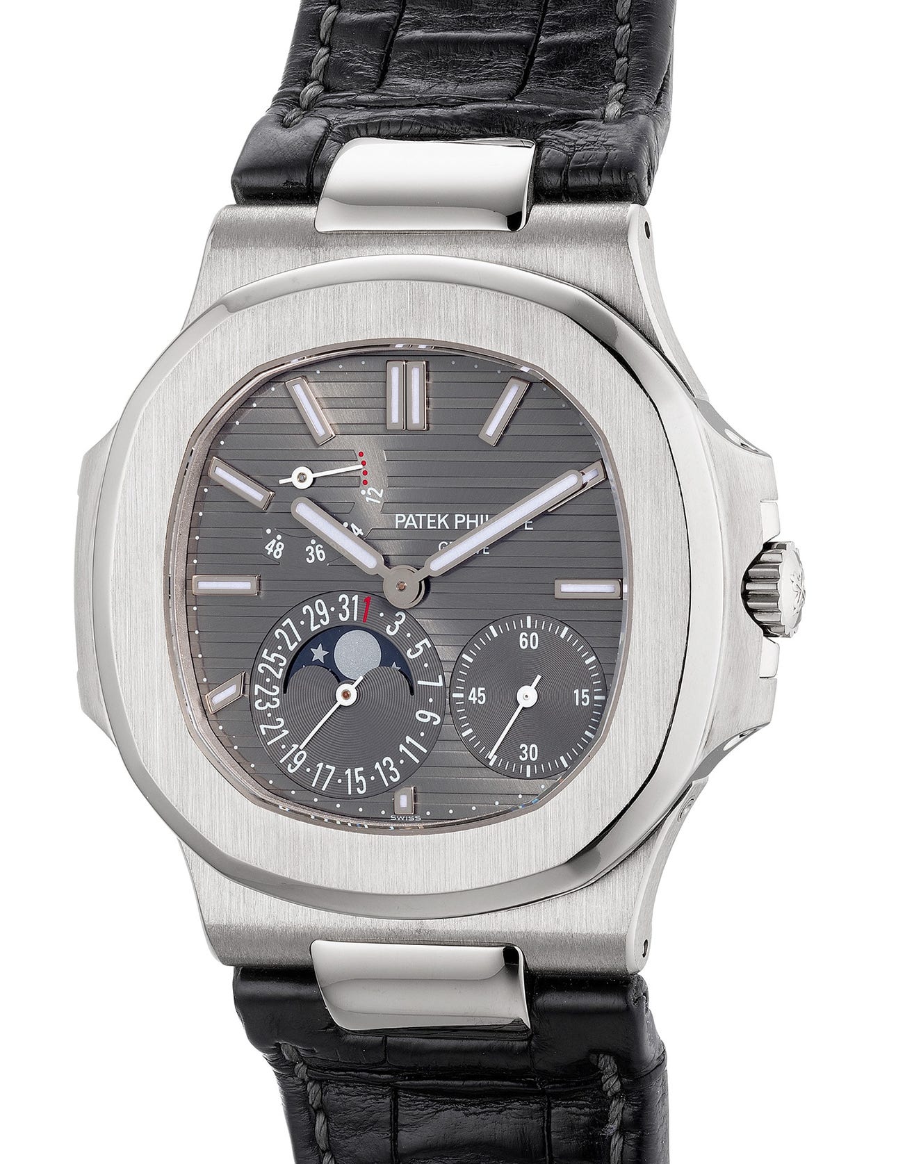Launched together with its stainless steel counterpart was the ref. 5712G-001. Encased in white gold, the timepiece displays subtle differences compared to its stainless steel model, such as a smoky grey dial instead of the blue dial featured in the stainless steel model, and a crocodile strap instead of an integrated bracelet. Offering a luxurious alternative of the model, the white gold ref. 5712 is certainly a classy and elegant timepiece while retaining its sporty appeal.