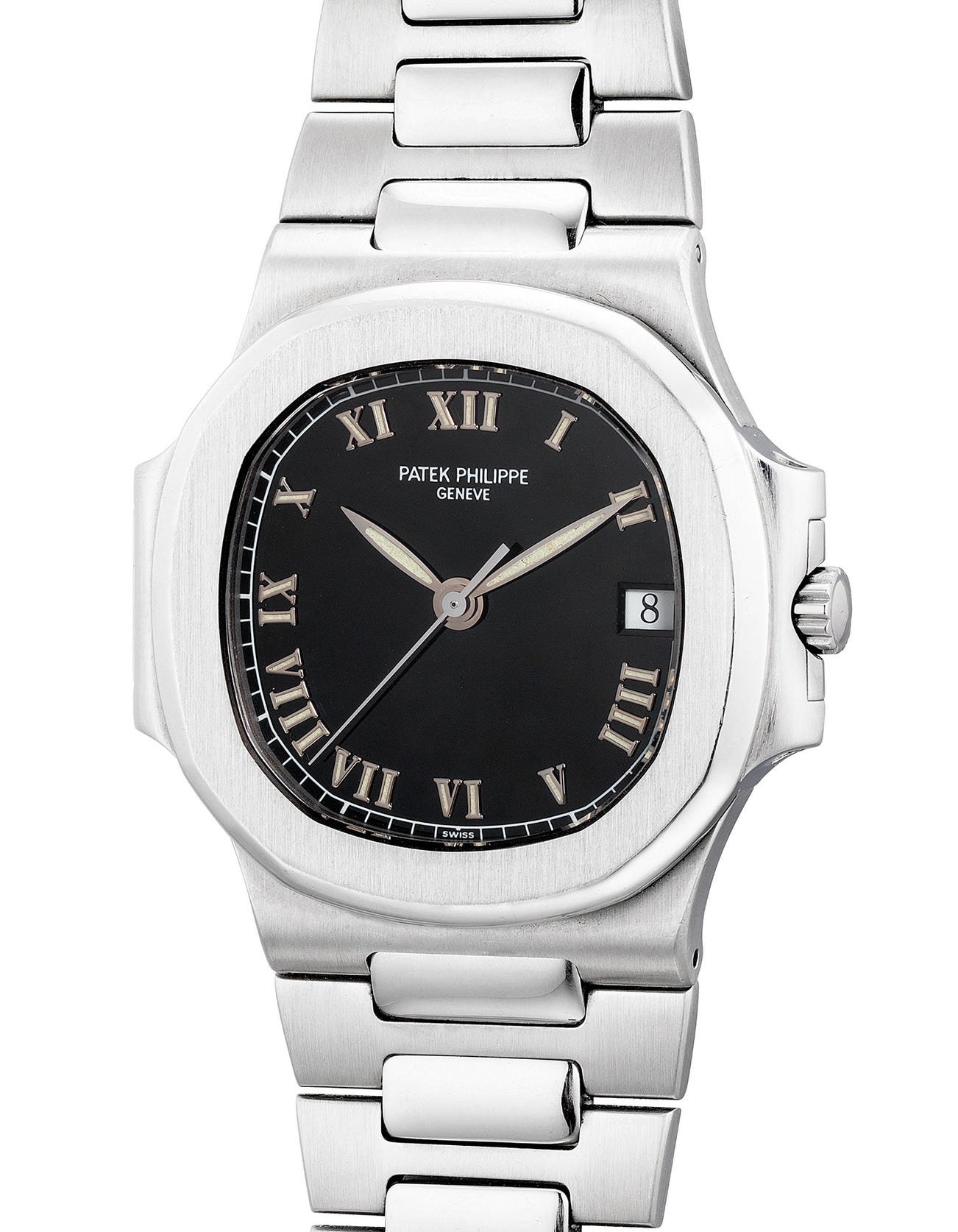 The present ref. 3800 from circa 1998 belongs to the last series of the reference produced confirmed by the caliber. Encased in stainless steel and fitted with a “glossy” black dial with applied luminous Roman numerals, this present variant of the ref. 3800 is perhaps one of the most unique as Roman numerals were never incorporated in the new line of Nautilus models again. Presented in attractive overall condition and accompanied by the original Patek Philippe Certificate of Origin, it is a fantastic opportunity for lovers of the Nautilus to acquire one of the most versatile models fit for both ladies and gentlemen.