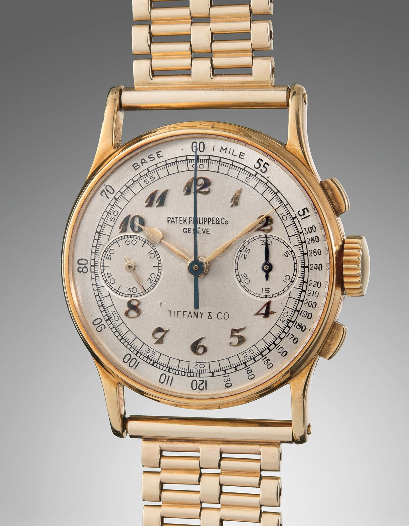 The watch still bears a crisply engraved name to its case back, with corresponding initials on the clasp of the bracelet – and research indicates a remarkable original owner. Usually, these names cannot be tied back definitively to a specific owner. In this case however, the original owner was likely one Arthur Knorr, born in Indiana at the turn of the century. Though he started as a commercial artist designing posters and advertisements for local theaters, he quickly gained recognition for his artistry and skill. His work ethic and passion for the performing arts led to his being appointed producer, designer, and director for an array of theatrical performances including Broadway shows, the White House Correspondents Dinner, and the Miss America and Miss Universe pageants. A highly desirable reference, stunning dial, prestigious Tiffany & Co. retailer signature, and fascinating original owner makes this a standout example of a reference 130 that is certain to delight any collector of vintage timepieces.