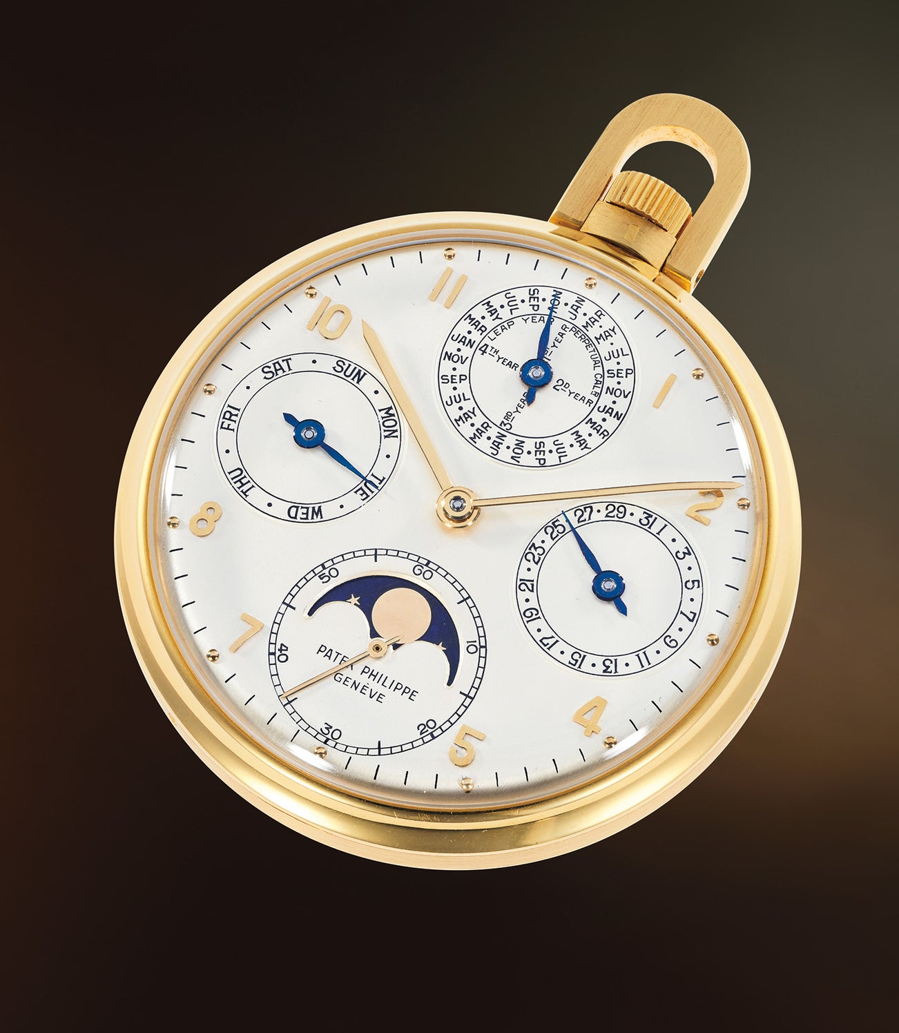 A rare and highly attractive yellow gold openface perpetual calendar pocket watch with moon phase