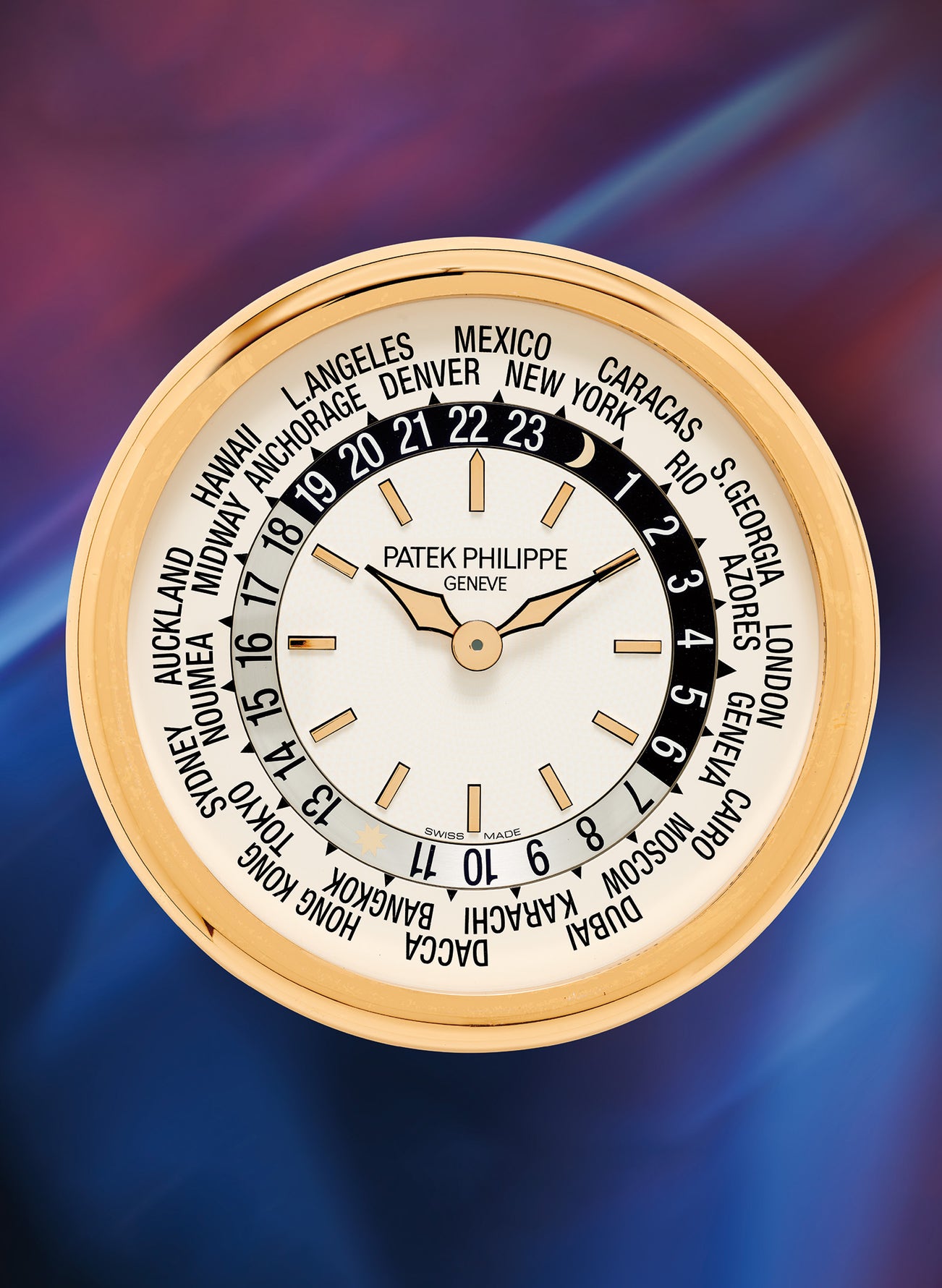 An attractive gilt brass world time wall clock with associated Patek Philippe ephemera