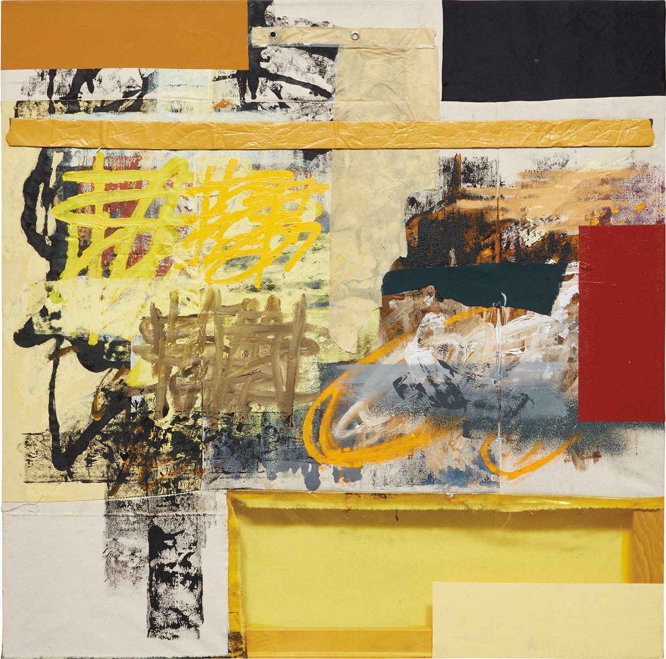 acrylic, oil, spray paint, stone spray, foam insulation and plastic shower curtain on sewn canvas, plastic and cotton fabric