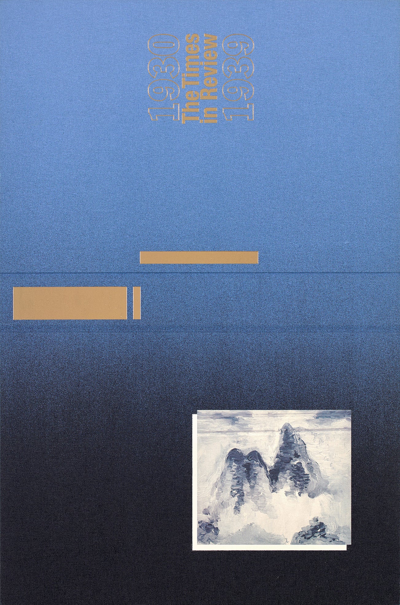 Screenprint in colors, on natural woven rayon cloth with foil stamping, mounted on wooden frame (as issued).