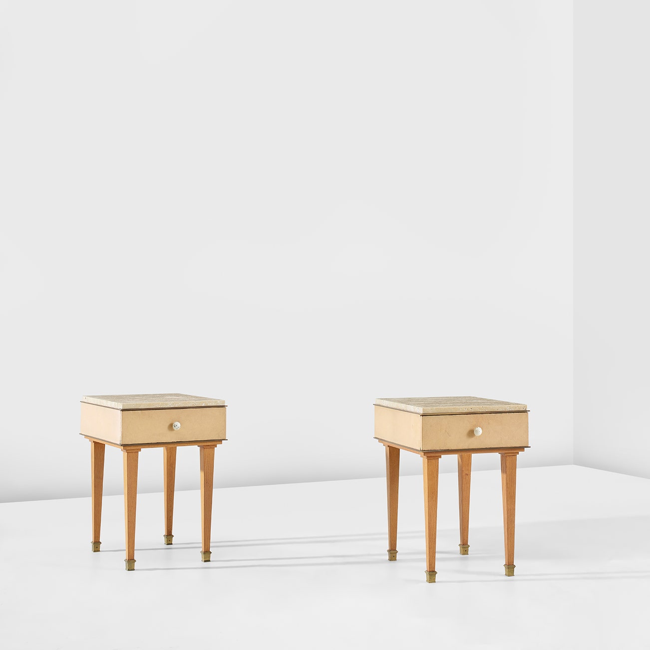 Travertine, oak, leather-covered wood, painted steel, brass.