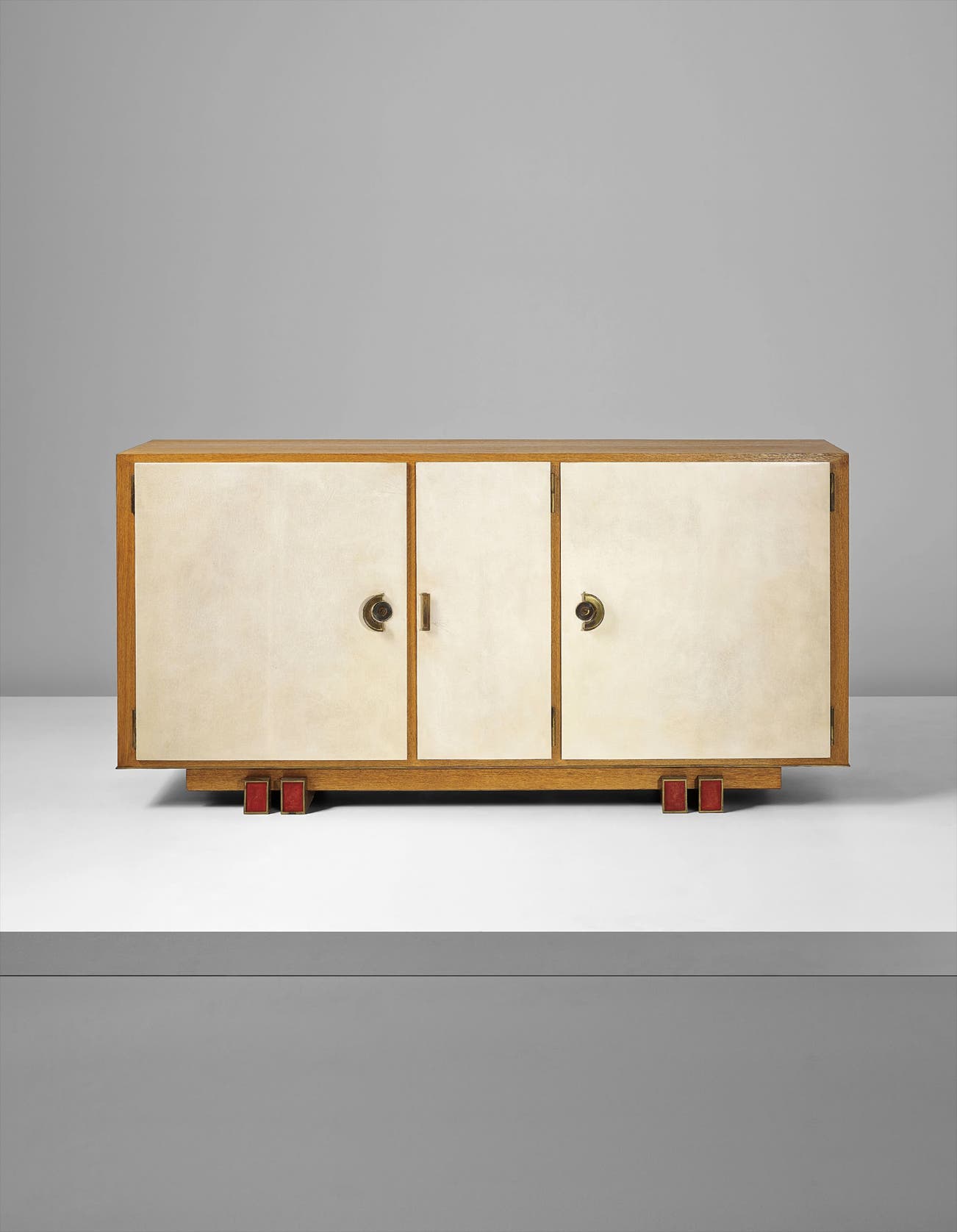 Oak-veneered wood, oak, parchment, leather, brass.