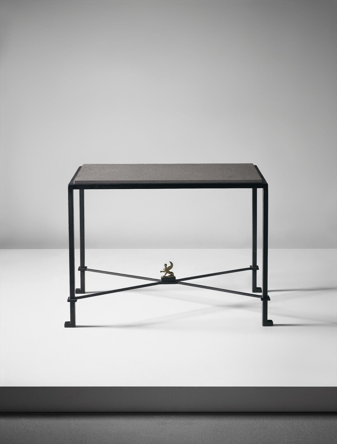 The present table was designed by Paul Dupré-Lafon as a stand to support a seventeenth-century chest in his own collection. The x-form stretcher is surmounted by a bronze sculpture of a sphinx by Alberto Giacometti, a small but critical flourish which animates the table's neoclassical rigor.