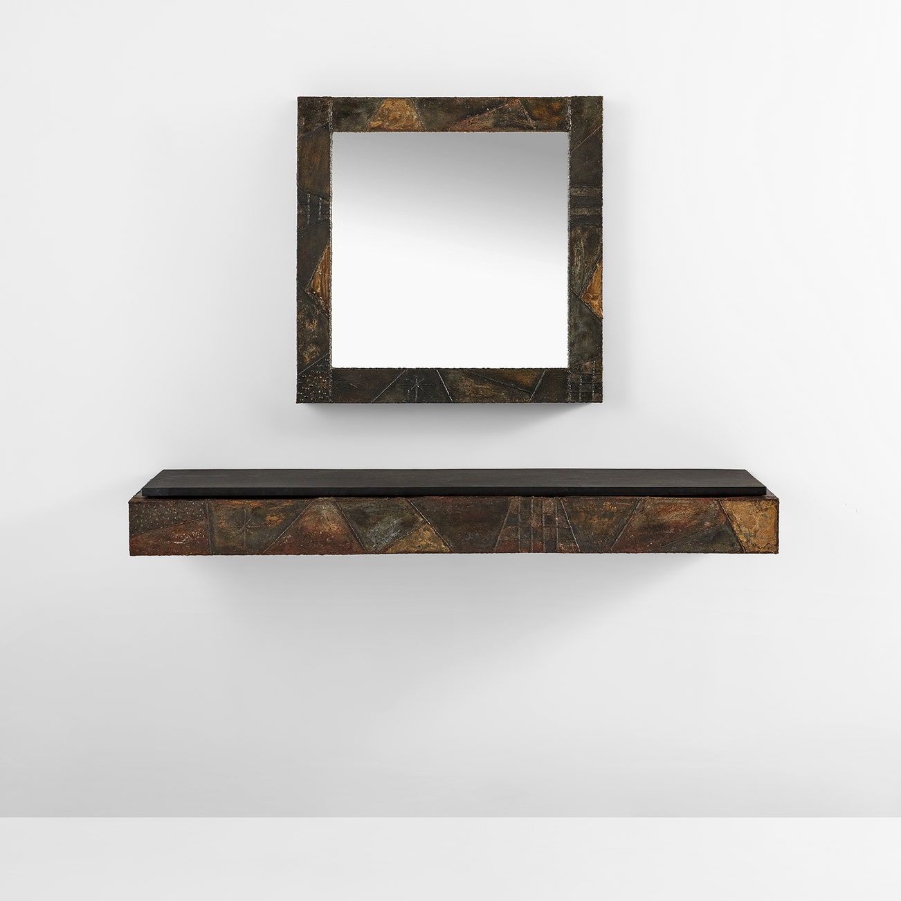"Patchwork" mirror, model no. PE-18, and wall-mounted shelf, model no. PE-17