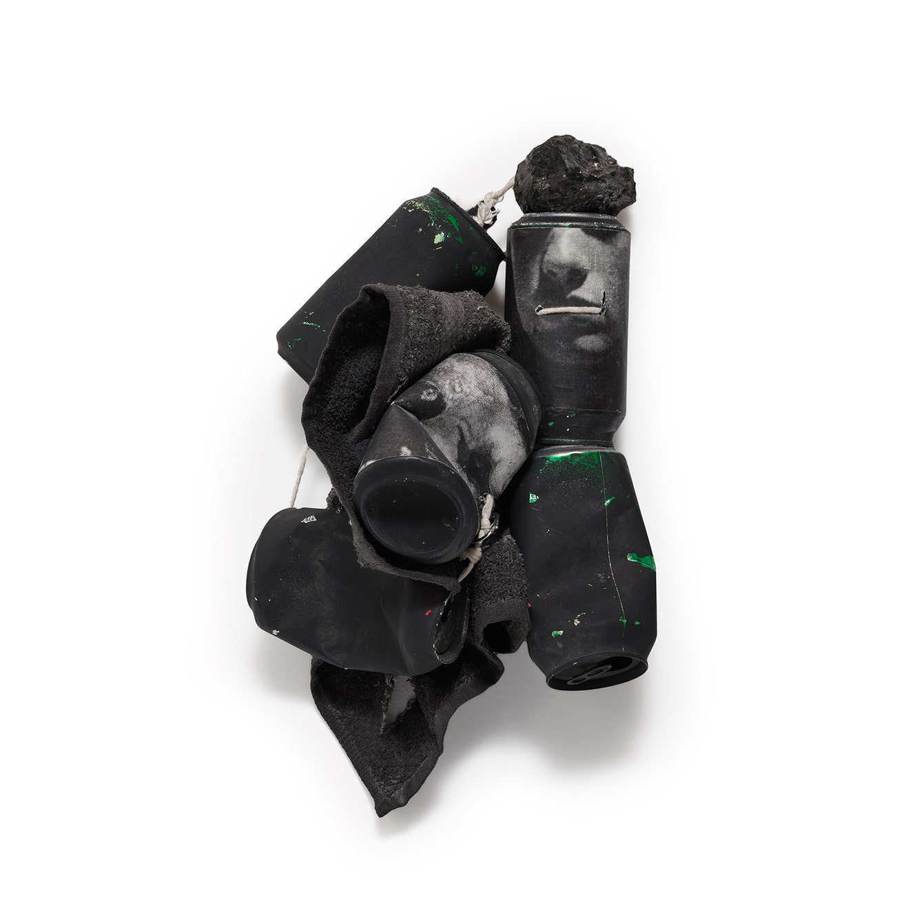 soda cans, string, spray paint, washcloth, rock, print and marker