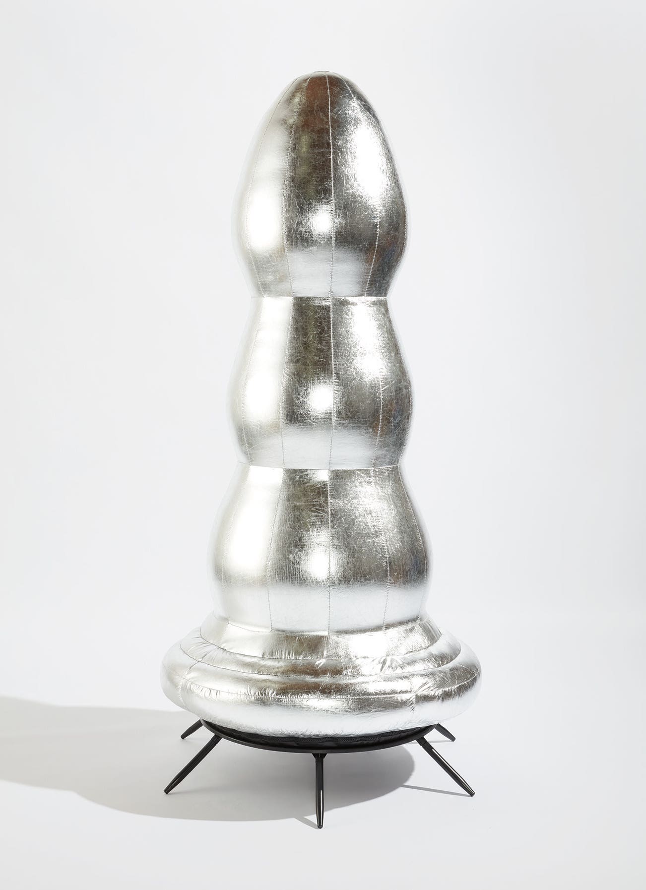 Self-inflatable Mylar fabric multiple with integrated fan, contained in original custom Mylar fabric carrier bag.