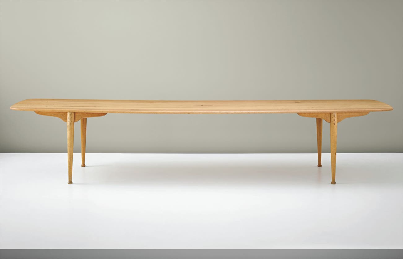 The present lot was commissioned in 1952 by the lumber dealer M. Aubertin and his wife for their house designed by the architect Finn Juhl. One of the few houses by Juhl, the ‘Villa Aubertin’ is located in Rosnæs, on the Nakskov Fjord. Although Mr and Mrs Aubertin had Juhl design all the fixtures and fittings, then dress the interior rooms with his furniture designs, which they much admired, it was the dining table, designed by the master cabinetmaker Peder Moos that was used for the dining room area.