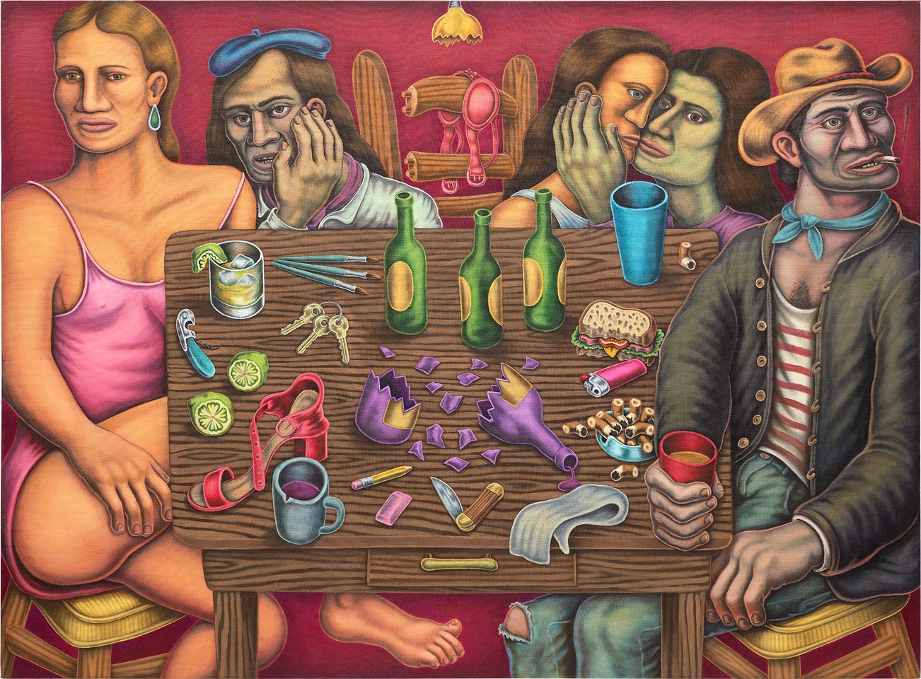 signed, titled and dated "Pedro Pedro 2019 "Figures Around A Table"" on the overlap