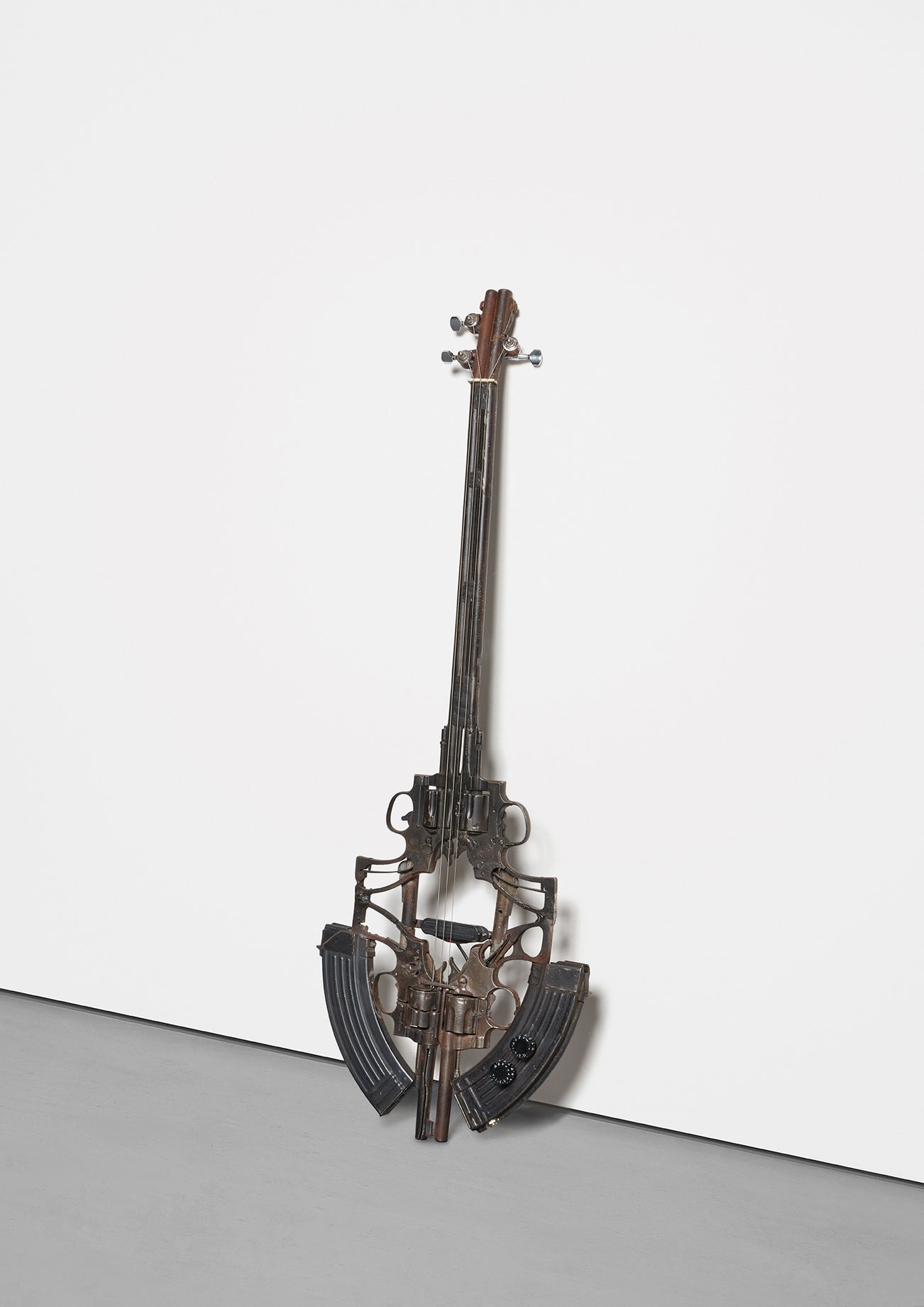 destroyed firearms, guitar strings, tuning pegs, electronic bridge, wiring and knobs